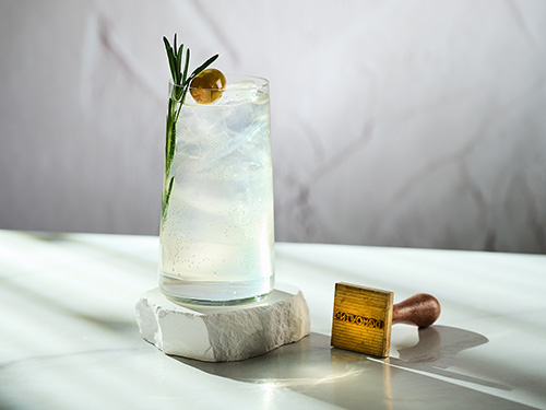 5 cl DOMOVINA Borovička, infúzovaná rozmarínom, 12 cl Franklin&Sons Indian tonic water, 1 cl šťava z olív zelených veľkých
